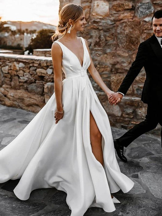 White Long A-line V-neck Satin Backless Wedding Dresses with Slit