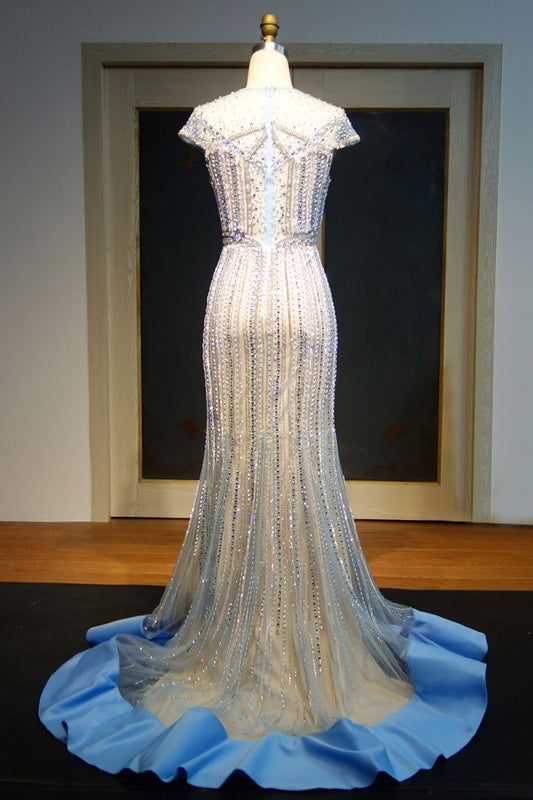 Cap Sleeves High Neck Sparkly Beads Floor-Length Mermaid Evening Party Gown