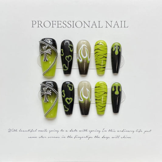 Forest Elf Green Premium White Hand Painted Nail Removable Press on Nail