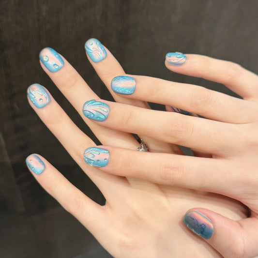 High Quality Ocean Blue Y2K Short Round 10pcs Press on Nails Handmade Custom Logo Artificial Acrylic Gel Nails