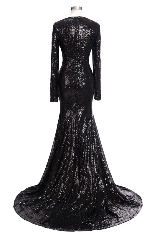 Long Mermaid V-Neck Black Sequins Prom Dresses with Sleeves