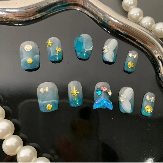 New Style Purely Handmade ABS Fully Transparent Summer Blue Mermaid Gel Artificial Nail Tips
