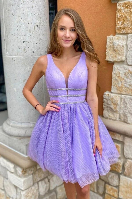 Purple Tulle A-line Short Homecoming Dresses With Belt, Graduation Dress