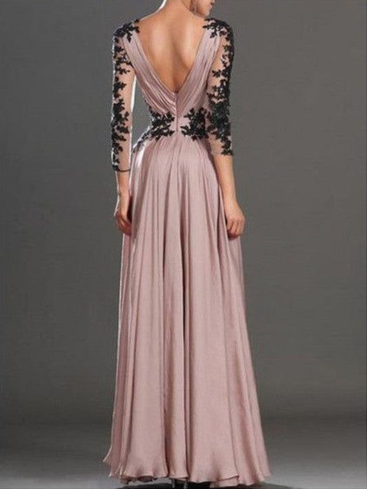 A-Line/Elegant Long Sleeves V-neck Applique Satin Prom Dresses