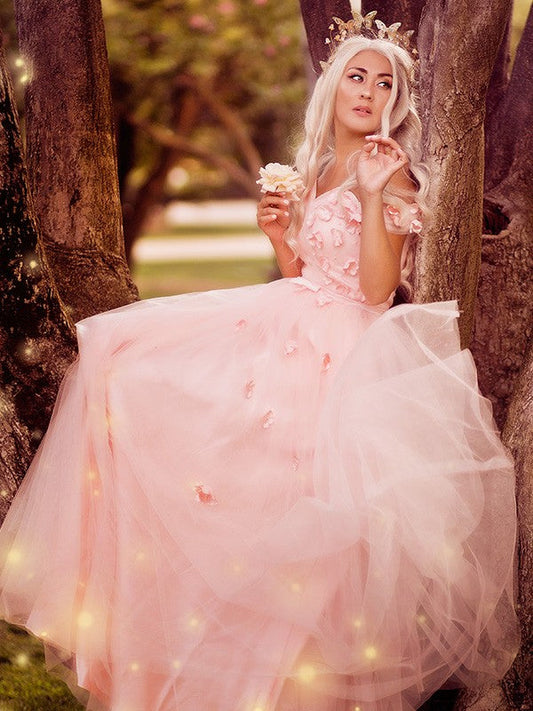 A-Line/Elegant Off-the-Shoulder Applique Tulle Sleeveless Floor-Length Prom Dresses