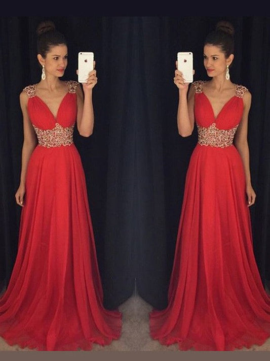 A-Line/Elegant Sleeveless V-neck Chiffon Beading Prom Dresses