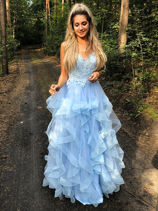 A-Line/Elegant Spaghetti Straps Sleeveless Floor-Length Applique Tulle Prom Dresses