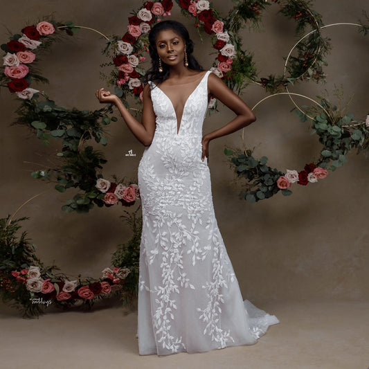 Charming V-Neck Floral Lace Mermaid Bridal Gown Sleeveless Sain Dress For Bride