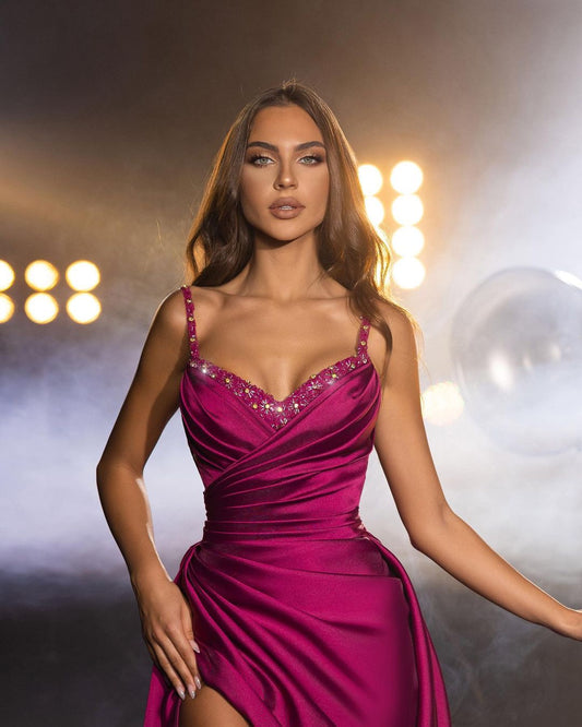 Gorgeous Long Fuchsia Straps Beading Sleeveless Pleated Prom Dress With Slit