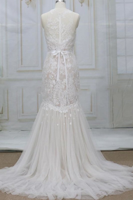 Beautiful Long Mermaid Lace Sleeveless Wedding Dress With Detachable Train