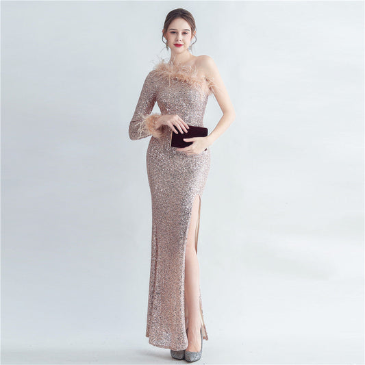 Heavy Industry Ostrich Hair Craft Bundle Hair Evening Dress with Oblique Shoulder Slit