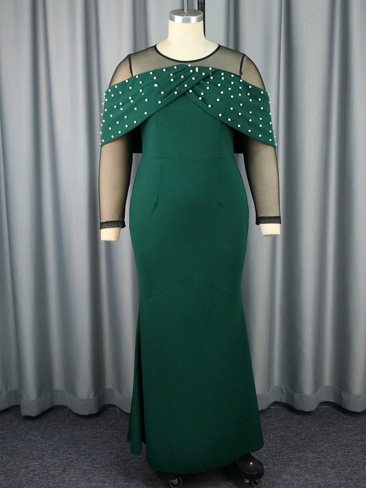Young See Through Sleeve High Waisted Beaded Evening Dress