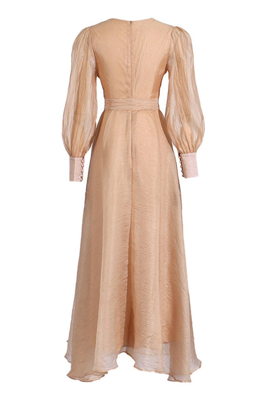 Celebrity Style V Neck Bishop Sleeve Belted Crinkled High Low Evening Dress