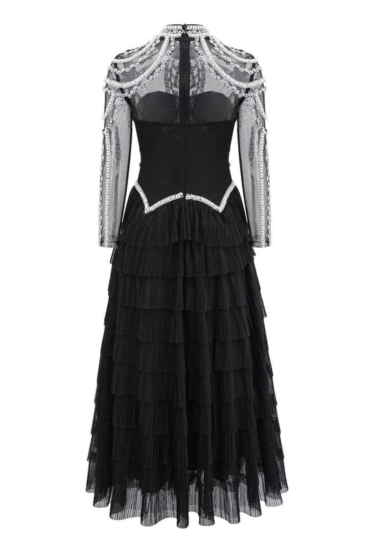 Luxury Crystal Pearl Beaded Drop Waist Tiered Tulle Maxi Evening Dress