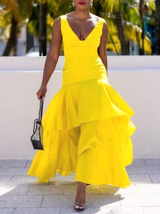 A-Line Loose Solid Color Split-Joint Tiered V-Neck Evening Dresses Maxi Dresses