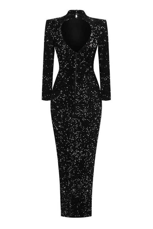 Sparkly Mock Neck Long Sleeve Cutout High Split Sequin Maxi Evening Dress