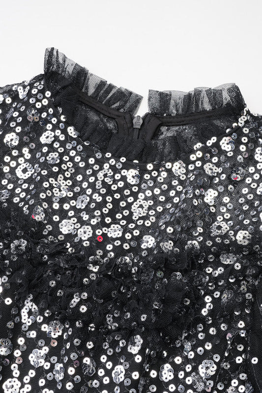 Sparkly Sequin Polka Dot Ruffle Mock Neck Tiered Tulle Maxi Evening Dress