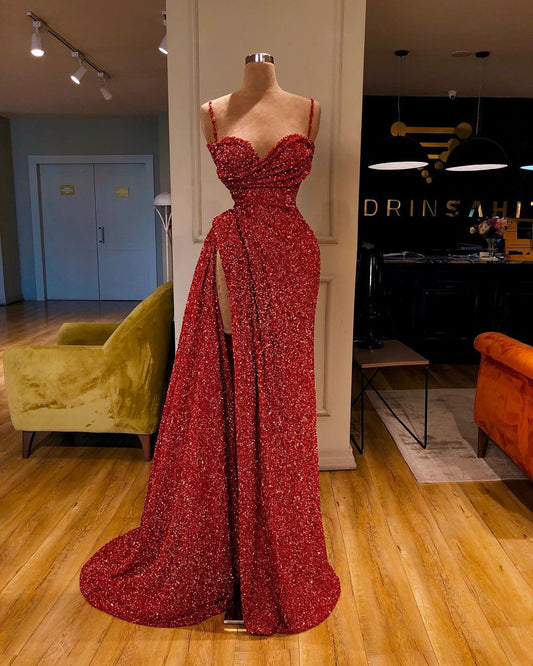 Sexy Long Mermaid Spaghetti Straps Sequins Prom Dress With Slit