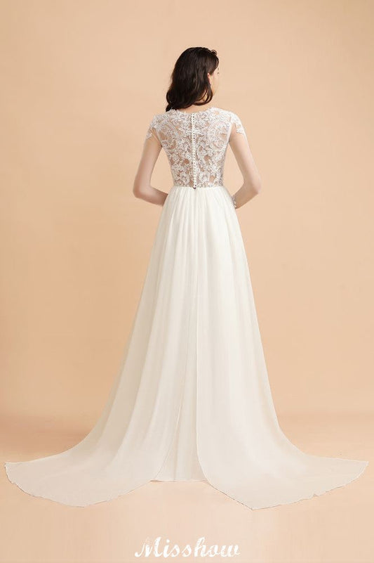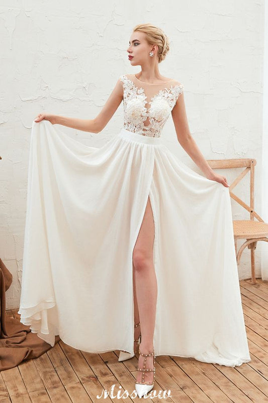 Sexy High Split Cap Sleeve Wedding Dress Sheer Back Ivory Lace Bridal Gown