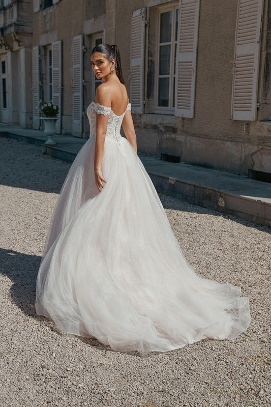 Wunderschönes langes A-Linien-Brautkleid aus Tüll mit schulterfreien Applikationen