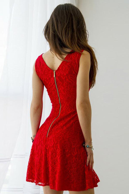 Rotes Etuikleid mit V-Ausschnitt und Spaghettiträgern aus Spitze, eng anliegend, Mini-Heimkehrkleider