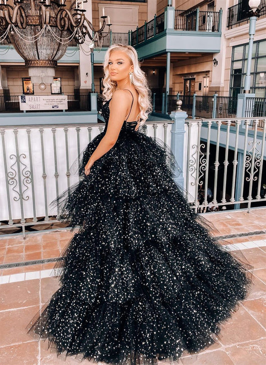 Roycebridal Yasmine | Schwarzes A-Linien-Ballkleid aus mehrlagigem Tüll mit V-Ausschnitt