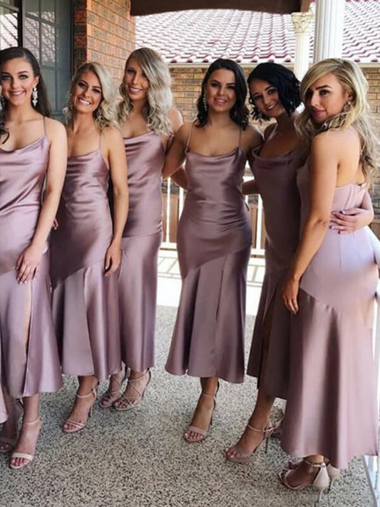 Satin Etui Spaghettiträger Wasserfallausschnitt Wadenlang Brautjungfernkleider
