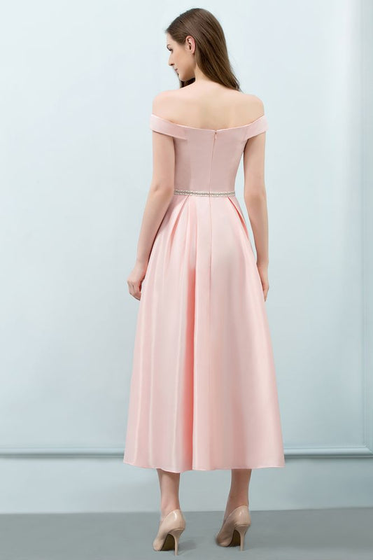 Teelanges rosa A-Linien-Ballkleid mit schulterfreiem Schnitt und Schärpe