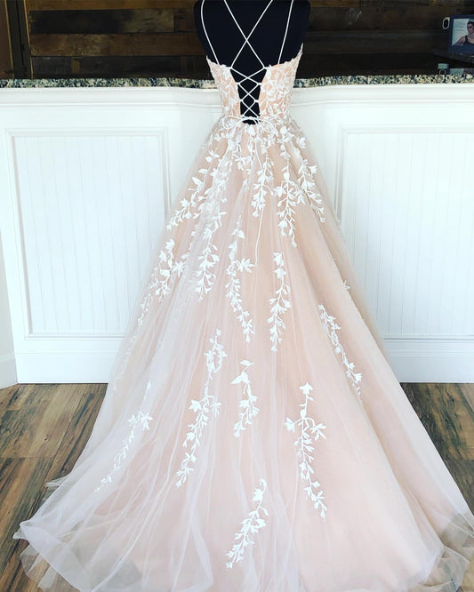 Langes A-Linien-Ballkleid mit Herzausschnitt und Spaghettiträgern aus Tüll mit offenem Rücken