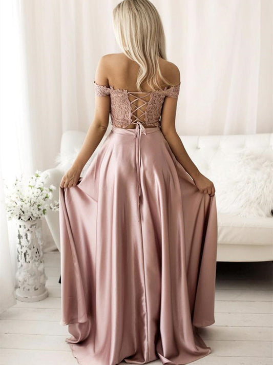 Langes, schulterfreies A-Linien-Ballkleid aus Satin und Spitze, zweiteilig