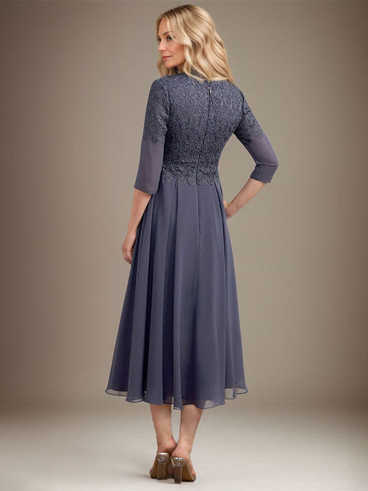 A-Linie V-Ausschnitt Wadenlang Chiffon Spitze Kleid für die Brautmutter mit Perlenbesatz