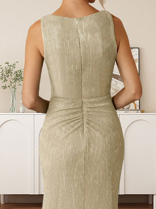 A-Linie V-Ausschnitt Wadenlanges Stretch-Satinkleid für die Brautmutter mit Perlenbesatz und Plissee
