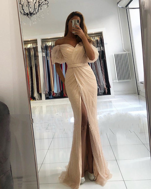 Meerjungfrau-Ballkleid mit schulterfreiem Schlitz vorne und langen Pailletten und Ärmeln
