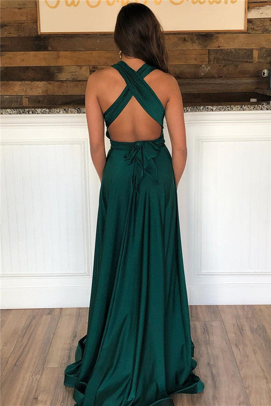 Dunkelgrünes langes A-Linien-Neckholder-Ballkleid mit offenem Rücken und Schlitz