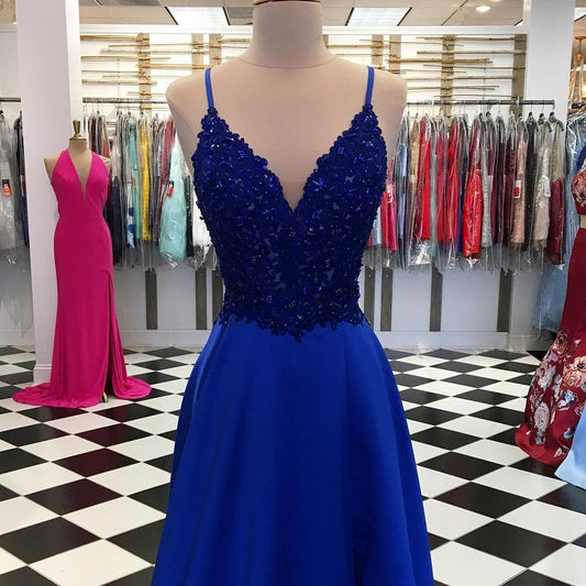 Königsblaues langes A-Linien-Abendkleid aus Satin mit Pailletten und V-Ausschnitt