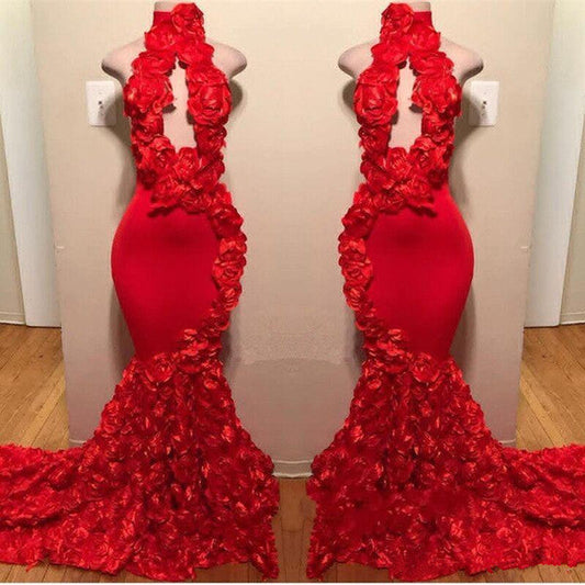 Sexy Lange Meerjungfrau Blumen Stehkragen Rote Ballkleider