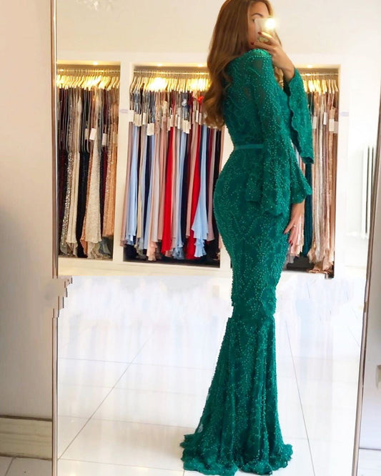 Grüne Meerjungfrau Sweetheart Spitze Lange Ballkleider mit Ärmeln