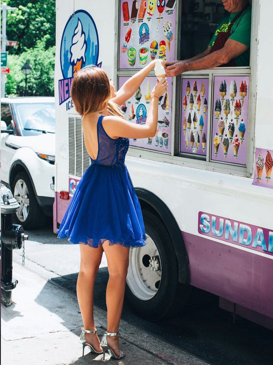 Kurzes, rückenfreies A-Linien-Heimkehrkleid aus Chiffon mit V-Ausschnitt und Schnürung