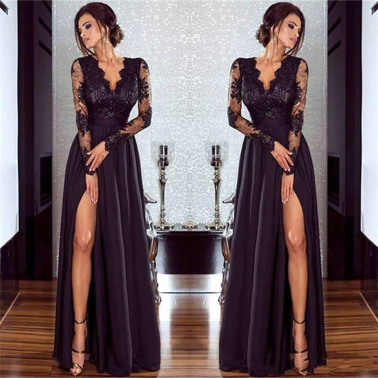 Schickes A-Linien-Ballkleid mit V-Ausschnitt und langen Ärmeln aus Chiffon und Spitze