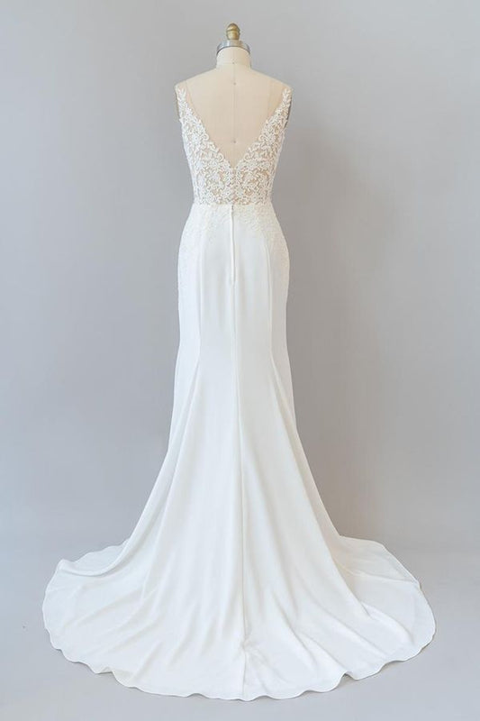 Elegantes langes Meerjungfrau-Brautkleid mit V-Ausschnitt und rückenfreiem Spitzendetail