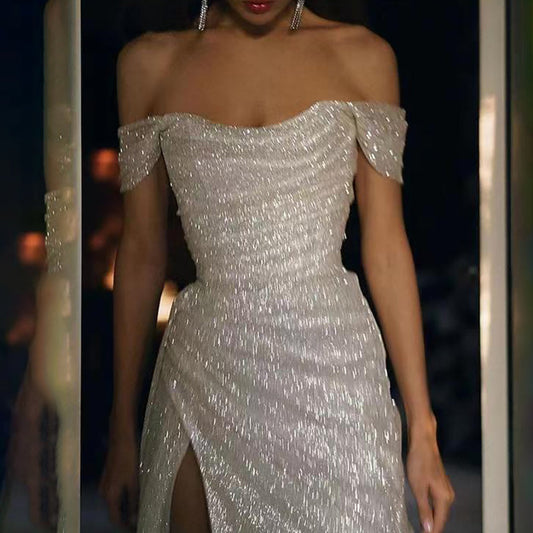 Elegantes schulterfreies ärmelloses A-Linien-Brautkleid mit Pailletten und Schlitz