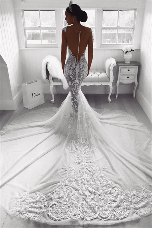 Meerjungfrau-Brautkleid aus Spitze, glamouröse Brautmode aus transparentem Tüll mit Knöpfen