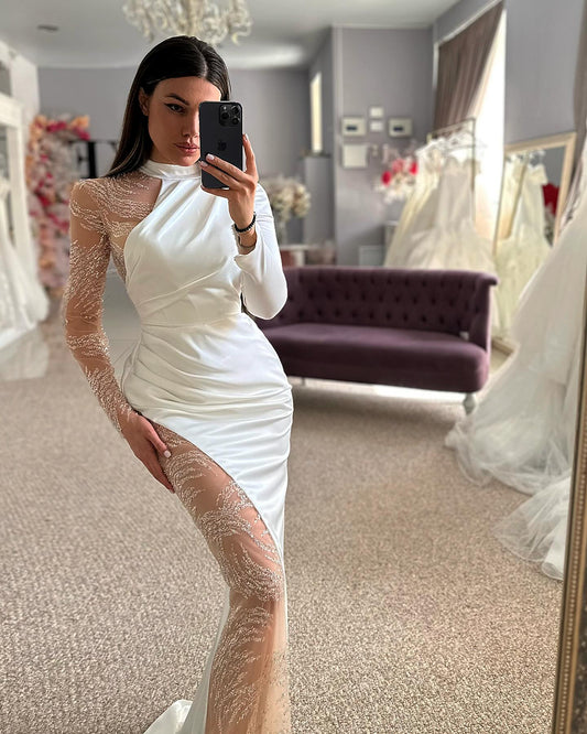Wunderschönes Neckholder-Brautkleid mit langen Ärmeln und Satinspitze und Applikationen