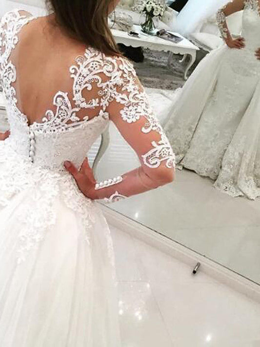 Langarm A-Linie Juwel-Ausschnitt Hofschleppe Spitze Tüll Brautkleider