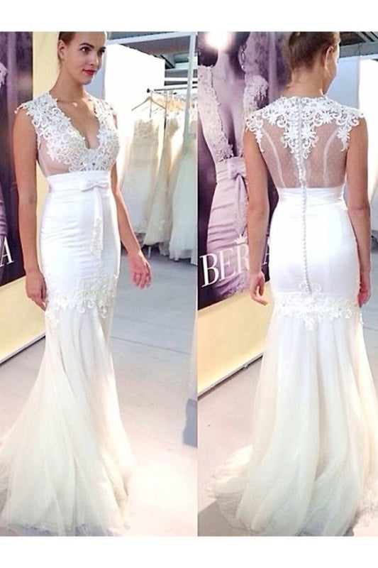 Schicke Applikationen Tüll V-Ausschnitt Ärmellos Meerjungfrau Elegante Brautkleider