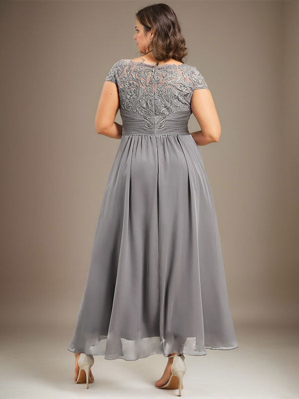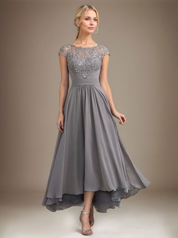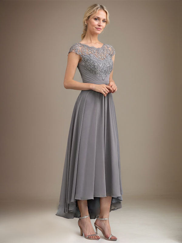 A-Linie U-Ausschnitt Illusion Asymmetrische Spitze Chiffon Mutter der Braut Kleid Mit Plissee