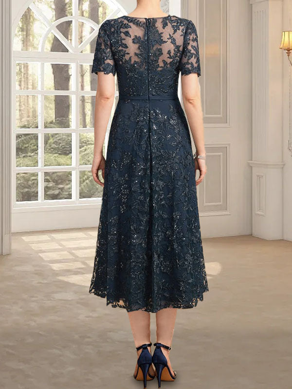 A-Linie, U-Ausschnitt, Illusion, knielang, Spitze, Kleid für die Brautmutter mit Pailletten
