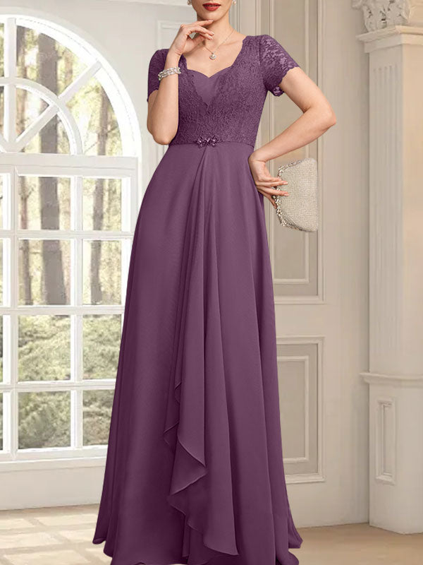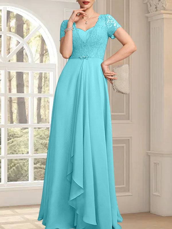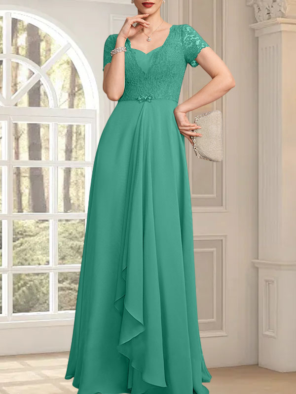 A-Linie, Herzausschnitt, bodenlang, Chiffon, Spitze, Kleid für die Brautmutter mit Perlenbesatz, kaskadierenden Rüschen