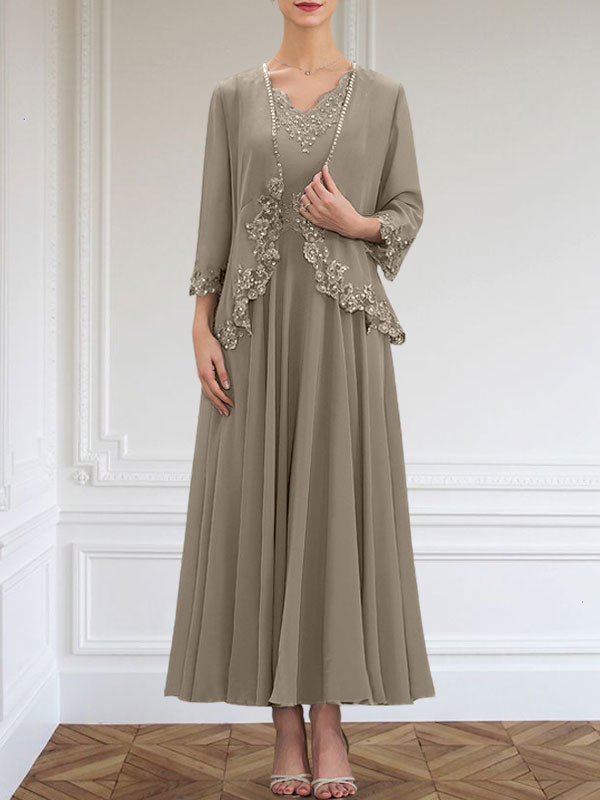 A-Linie V-Ausschnitt Knöchellang Chiffon Kleid für die Brautmutter mit Pailletten Applikationen Spitze Perlen