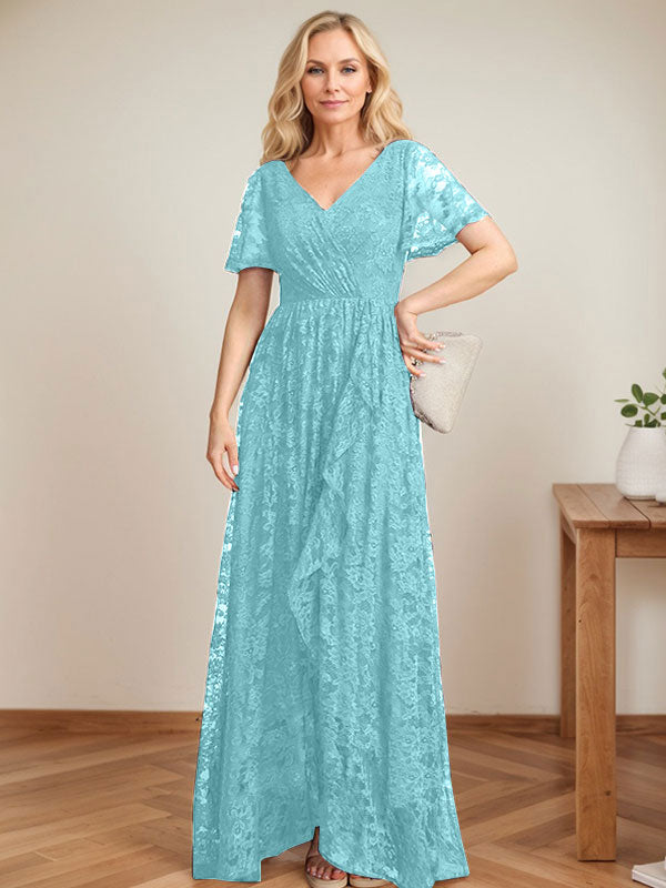 A-Linien-Kleid mit V-Ausschnitt, asymmetrischer Spitze für die Brautmutter mit kaskadierenden Rüschen